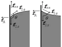 ![]() Forces at contact point shown for contact angle greater than 90° (left) and less than 90° (right) |
