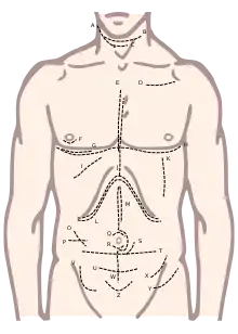 - Lanz incision – A variation of the traditional Mc Burney's incision, which was made at McBurney's point on the abdomen: The Lanz incision is made at the same point along the transverse plane and deemed cosmetically better. It is typically used to perform an open appendectomy. Variations exist on the method used to locate the incision. Some surgeons advocate that the incision is made approximately 2 cm below the umbilicus centered on mid-clavicular-midinguinal line. Others imply use of McBurney's point to center the incision (1/3rd of the distance from the anterior superior iliac spine to the umbilicus).