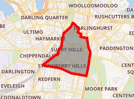 Surry Hills is an inner city, eastern suburb of Sydney, in the state of New South Wales, Australia. Surry Hills is immediately south-east of the Sydney central business district in the local government area of the City of Sydney. Surry Hills is surrounded by the suburbs of Darlinghurst to the north, Chippendale and Haymarket to the west, Moore Park and Paddington to the east and Redfern to the south.[2]