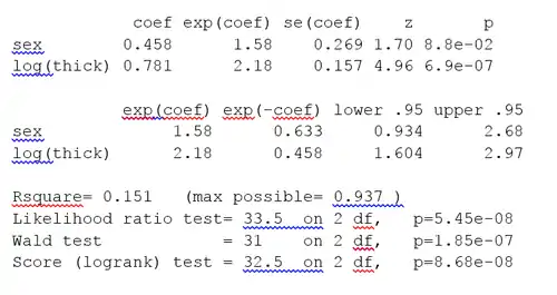 The p-value for all three overall tests (likelihood, Wald, and score) are significant, indicating that the model is significant. The p-value for log(thick) is 6.9e-07, with a hazard ratio HR = exp(coef) = 2.18, indicating a strong relationship between the thickness of the tumor and increased risk of death.