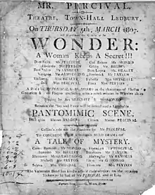 The main source of information on Centlivre's early life is Giles Jacob, who claimed he had received an account of it directly from her. This was published in The Poetical Register of 1719, yet it includes little information about her early life.[3] Centlivre was probably baptised Susanna Freeman at Whaplode, Lincolnshire on 20 November 1669, as the daughter of William Freeman of Holbeach and his wife, Anne, the daughter of Mr Marham, a gentleman of Lynn Regis, Norfolk.[4] Her father was a dissenter and a parliamentarian; as a result, the family certainly faced persecution at the Restoration.[4] Several biographical sources state that Holbeach was the possible place of her birth or at least the place where she spent her childhood. There is some mystery surrounding her early life, but it is generally believed that her father died when she was three, her mother died shortly after remarrying, and her stepfather married soon after that.[5] Abuse by this new stepmother may have motivated Centlivre to leave her childhood home before the age of 15.[6]