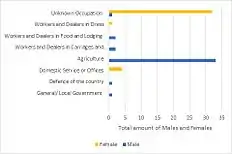 Furthermore, gender inequality also exists here, regarding the number of females working in this industry, as zero females were reportedly employed in this sector, compared to the 33 males which were. One reason for this was that in the 19th century, gender roles, which are structured around femininity and masculinity, were conceptions of what society deemed acceptable. As a result, gender inequality existed here, in that the role of a male in society was to provide for their family, typically engaging in work involving manual labour; whereas the role of a woman was oriented to the home, raising children and caring for the family. Evidence of this can be seen in the graph, as 86% of women in the village are in unknown occupations. The second most common occupation for women here is domestic services with four females working in this sector, suggesting that women worked as carers or nannies.[10]