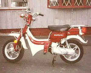 Produced by Suzuki, it was known by the nickname "Suzy" in UK, but in other markets as Youdy. It had a 49 cc (3.0 cu in) two-stroke pivoted engine integral with the transmission, and a coil-over damper mounted to the single-sided swinging arm enclosing the chain final drive.