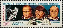 On July 17, 1984 Savitskaya launched aboard Soyuz T-12, together with Commander Vladimir Dzhanibekov and research cosmonaut Igor Volk. On July 25, 1984, Savitskaya became the first woman to spacewalk, conducting EVA outside the Salyut 7 space station for 3 hours and 35 minutes, during which she cut and welded metals in space along with her colleague Vladimir Dzhanibekov.[5][6] Of the 57 Soviet/Russian spacewalkers through 2010, she is the only woman, and as of April 2020 is still the only Soviet/Russian woman to walk in space. The return to Earth took place on July 29, 1984.