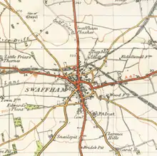 The east-west A47 Birmingham to Great Yarmouth road now avoids the town, using a northerly bypass opened in 1981. The A1065 Mildenhall to Fakenham road still passes through the centre of the town on its north-south route, intersecting with the A47 at a grade separated junction north of the town.[16]