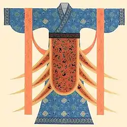 During the Wei, Chin and the Northern and Southern dynasties, though men no longer wore the traditional one-piece garment, some women continued to do so. However, the style was quite different from that seen in the Han dynasty. Typically the women's dress was decorated with "hsien" (襳) and "shao" (髾). The latter refers to pieces of silk cloth sewn onto the lower hem of the dress, which were wide at the top and narrow at the bottom, so that triangles were formed overlapping each other. "Hsien" refers to some relatively long ribbons which extended from the short-cut skirt.[2] While the wearer was walking, these lengthy ribbons made the sharp corners and the lower hem wave like a flying swallow, hence the Chinese phrase "beautiful ribbons and flying swallowtail" (華帶飛髾).