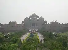 Swaminarayan Akshardham (New Delhi) is a Hindu temple, and spiritual-cultural campus in New Delhi, India. The temple is close to the border with Noida. Also referred to as Akshardham Temple or Akshardham Delhi, the complex displays millennia of traditional and modern Hindu culture, spirituality, and architecture. Inspired by Yogiji Maharaj and created by Pramukh Swami Maharaj, it was constructed by BAPS.[1]