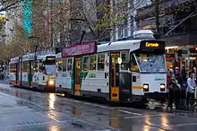 Swanston Street was previously served by bus services to Gardenvale and Middle Brighton. When Melbourne-Brighton Bus Lines' licence periodically came up for review, the Melbourne City Council and Melbourne & Metropolitan Tramways Board always opposed.[7][8][9] Finally the buses were removed from Swanston Street in October 1989, by which time they were operated by the Public Transport Corporation.[10]