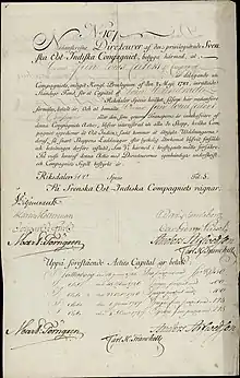 A commission to investigate the applications was appointed on 24 March 1746, and some weeks later on 14 May, they concluded that the directors from the first charter were best suited to lead the second as well.[64] However, the number of directors was increased from three to at least seven. In addition to Colin Campbell, Niclas Sahlgren and Teodor Ankarcrona, the directors were former secretary of the Executive Board Magnus Lagerström, the Stockholm merchants Anders Plomgren and Abraham Grill. These six members of the board later elected Claes Grill, Jacob von Utfall Jeanson, S. N. Wenngren and Nils Ström as directors.[65]