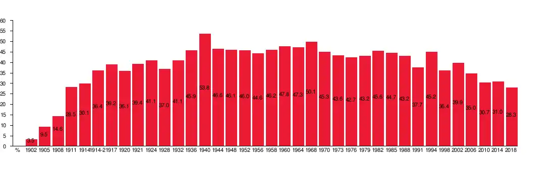 In the 2006 Swedish general election, the SAP received the smallest share of votes (34.99%) ever in a Swedish general election with universal suffrage, resulting in the loss of office to the opposition, the centre-right coalition Alliance for Sweden.[23] Among the support that the SAP lost was the vote of pensioners (down 10% from 2002) and blue-collar trade unionists (down 5%). The combined SAP and Left Party vote of citizens with non-Nordic foreign backgrounds sank from 73% in 2002 to 48% in 2006. Stockholm County typically votes for the centre-right parties and only 23% of Stockholm City residents voted for the SAP in 2006.[24]