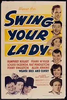 Swing Your Lady is a 1938 country musical comedy film directed by Ray Enright, starring Humphrey Bogart, Frank McHugh, and Louise Fazenda. Also featured in the cast is Ronald Reagan in one of his early roles.