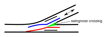 A variety of swingnose crossing, suitable for locations where a branch line turns off a higher-speed line, is the swing wing crossing. In this device, the V-crossing does not need its own motor but is moved by the flange of an approaching wheel on the branch track. It returns to its normal position when the diverging train has passed, pushed by a damped spring.[1]