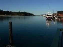 The Swinomish Channel is an 11-mile (18 km) long[1] salt-water channel in Washington state, United States, which connects Skagit Bay to the south, and Padilla Bay to the north, separating Fidalgo Island from mainland Skagit County.[2] The Swinomish Channel is the smallest of the three entrances to Puget Sound—the other two being Deception Pass and Admiralty Inlet.[3]