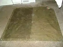 Swiss Militärblachen, a kind of Military Shelter-half are square tarpaulins printed with camouflage. They are used as rain protection, as elements in bivouac and for camouflaging military equipment. They are specially treated and therefore water repellent and highly resistant to abrasion and dirt."Blache" is Swiss German, the word is not used in any other german-speaking country. In Germany and Austria shelter-halves are known as "Mehrzweckplane", however, the ones used there are shaped trapezoidal.