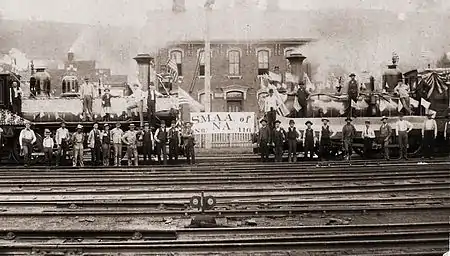 The first trade union of American railway switchmen was a local organization founded in the city of Chicago during the tumultuous labor struggles of 1877. In June of that year James Cullerton, a switchman for the Lake Shore & Michigan Southern Railway, sent word to the various rail yards of the city asking for three delegates from each to be dispatched to an organizational meeting.[1] A total of 15 delegates showed up for the meeting, which launched a short-lived organization called the Switchmen's Brotherhood.[1] This was supplanted by a new organization on August 18 of the same year called the Switchmen's Union, with Cullerton again playing a leading role.[1] This organization continued in existence at least through 1881, failing to expand outside of Chicago but nevertheless providing a nucleus for development of a future union.[2]