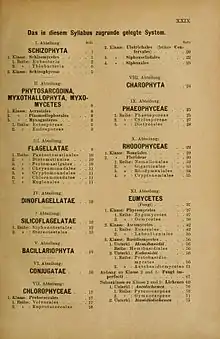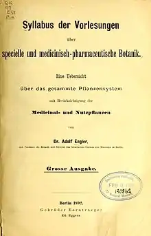 Engler's starting point was that of Eichler who had been the first to use phylogenetic principles, and reflected the new post-Darwinian perspective, although Engler himself did not think that his was.[2] His modified Eichler schema first appeared in 1886 in his Guide to Breslau Botanic Garden[3] (of which he was the director) and was expanded in his Syllabus in 1892.[4] This reflected the new post-Darwinian perspective. Engler's Syllabus der Pflanzenfamilien first appeared in 1892 with the title Syllabus der Vorlesungen über specielle und medicinisch-pharmaceutische Botanik. Many subsequent editions have appeared since, and it was continued after Engler's death in 1930. The most recent edition was the 13th in 2009.[5] A number of references to the Engler system actually refer to later revisions ('modified Engler system') undertaken by Melchior and colleagues, the 12th edition of the Syllabus, also referred to as the Melchior system.