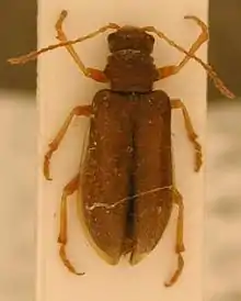 The beetle is 5.4–7.5 millimetres (0.21–0.30 in) long. Body is elongated, pubescent, and brown. Paws and antenna are red coloured. The males is darker than the females, often completely dark brown. Pronotum narrower than elytron, its laterally marginal, with 3-4 sharp teeth and thickened anterior angles.