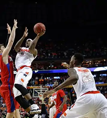 The Orange underperformed 2014–15 expectations with an 18–13 record behind First Team All-ACC center Rakeem Christmas.[39] Though the team was not eligible for the NCAA tournament due to the self-imposed post-season ban by the university, this would change in the following 2015–16 season as the Orange made the Final Four as a 10-seed by defeating Dayton, Middle Tennessee, Gonzaga, and Virginia.