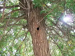 The neat, round 5 cm diameter nesting hole, is bored in soft or decaying wood horizontally for a few inches, then perpendicularly down. At the bottom of the shaft, a small chamber is excavated, where up to 11 creamy white eggs are laid on wood chips. The hole is rarely used again, but not infrequently other holes are bored in the same tree. Almost any tree sufficiently rotten is used. The young, when the parents are feeding them, cluster at the mouth of the hole and keep a continuous chatter, but when alarmed slip back into the hole.