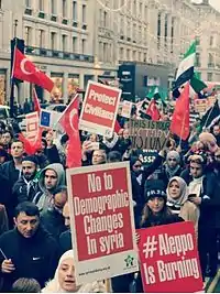 Syrian Turkmen waving Turkish and Syrian flags whilst shouting slogans: "No To Demographic Changes in Syria" and "No To Genocide" during the December 2016 protests in London.