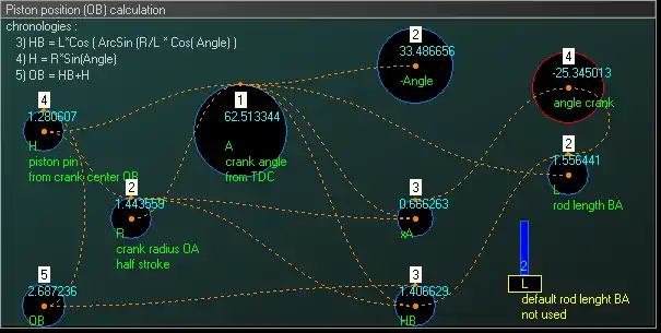 We want to model a crank-connecting rod system through a system dynamic model. Two different full descriptions of the physical system with related systems of equations can be found here (in English) and here (in French); they give the same results. In this example, the crank, with variable radius and angular frequency, will drive a piston with a variable connecting rod length. - System dynamic modeling: the system is now modeled, according to a stock and flow system dynamic logic.