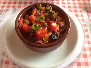 Türlü is a casserole of Turkish cuisine. It is made of stewed vegetables and may also include stewed meat.[1][2][3] Varieties of this dish are also found in Balkan cuisines. In particular, it is known as turli perimesh in Albania,[4] tourlou or tourlou tourlou in Greece,[5] and as turli tava in North Macedonia.[6]