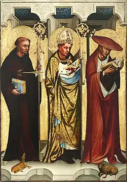 The Třeboň Altarpiece, also known as Wittingau altarpiece, is one of the most important works of European Gothic panel painting.[1] Of the original large altarpiece retable created in about 1380 by an anonymous Gothic painter called the Master of the Třeboň Altarpiece, three wings, painted on both sides, have survived. The altarpiece is one of the works that helped towards the emergence of the International Gothic style (called the Beautiful Style in the Bohemian lands) and which influenced the development of art in a broad European context.[2][3] It was originally created for the Augustinian Church of St Giles in Třeboň and is now part of the permanent collection of medieval art of the National Gallery in Prague.