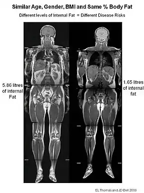 TOFI[1][2] (thin-outside-fat-inside) is used to describe lean individuals with a disproportionate amount of fat (adipose tissue) stored in their abdomen. The figure to illustrate this shows two men, both 35 years old, with a BMI of 25 kg/m2. Despite their similar size, the TOFI had 5.86 litres of internal fat, whilst the healthy control had only 1.65 litres.