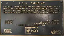 In 1990, the TSS Earnslaw was recognised as a significant part of New Zealand's engineering heritage by the Institution of Professional Engineers New Zealand (now Engineering New Zealand). The recognition was part of the “Engineering to 1990” project which the Institution organised to help celebrate the country’s sesquicentenary in 1990. A plaque was fixed to the vessel to that reads: "IPENZ recognises this engineering work as an important part of NZ's engineering heritage. The largest steamship built in NZ it is now one of the world’s last coal-fired passenger steamers".[6]