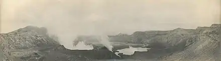 Great changes took place in the crater after the eruption. Before 1911, the crater floor was higher than Taal lake and had several separate openings in which there were lakes of different colors. There was a green lake, a yellow lake, a red lake and some holes filled with hot water from which steam issued. Many places were covered with a shaky crust of volcanic material, full of crevices, which was always hot and on which it was rather dangerous to walk. Immediately after the explosion, the vari-colored lakes had disappeared and in their place was one large lake, about ten feet below the level of the lake surrounding the island. The crater lake gradually rose until it is on a level with the water in Taal Lake. Popular opinions after the creation of the lake held that the presence of the water in the crater has a tendency to cool off the material below and thus lessen the chances of an explosion or make the volcano extinct, but the preponderance of expert opinion was otherwise.[8](The subsequent eruption in 1965 and succeeding activities came from a new eruptive center, Mount Tabaro.)