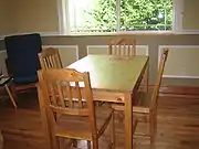 A table is an item of furniture with a flat top and one or more legs, used as a surface for working at, eating from or on which to place things.[1][2] Some common types of table are the dining room table, which is used for seated persons to eat meals; the coffee table, which is a low table used in living rooms to display items or serve refreshments; and the bedside table, which is used to place an alarm clock and a lamp. There are also a range of specialized types of tables, such as drafting tables, used for doing architectural drawings, and sewing tables.