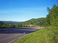 A grade crossing with a flashing overhead warning beacon was replaced in 2000 by a grade-separated exit, making the Appalachian Trail's crossing here less hazardous.[10] The Taconic levels off into a narrow section bearing due northeast along Hosner Mountain's steep west slope, with stone walls on either side. This ends after a mile with the Interstate 84 (I-84) interchange, the only full cloverleaf along the Taconic.[11]
