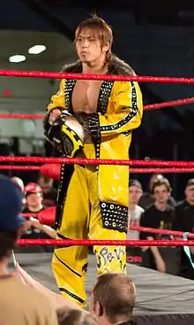 Following the title loss, Ishimori began working for New Japan Pro-Wrestling (NJPW) as one of their "Young Lions" prospects. Very early in his NJPW run he was teamed up with Hiroshi Tanahashi for a one night U-30 (Under 30) tag team tournament. In the first round the team defeated Blue Wolf and Katsuhiko Nakajima and in the finals they defeated Ryusuke Taguchi and Shinsuke Nakamura to win the tournament.[3] At one point he teamed up with his mentor Último Dragón for an unsuccessful shot at the IWGP Junior Heavyweight Tag Team Championship, held by Jado & Gedo at the time.[4] By mid-2005, Ishimori had left NJPW and begun working for All Japan Pro Wrestling (AJPW).