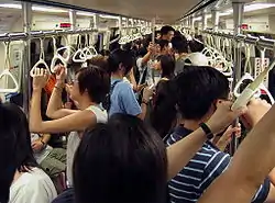 Stations become extremely crowded during rush hours, especially at transfer stations such as Taipei Main Station, Zhongxiao Fuxing, and Minquan West Road. Automated station announcements are recorded in Mandarin, English, Hokkien, and Hakka, with Japanese at busy stations.[30]