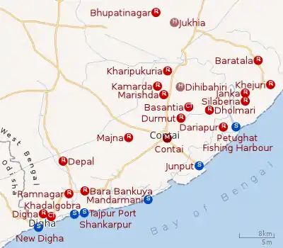 | Cities and towns in Contai subdivision of Purba Medinipur district M: municipal city/ town, CT: census town, R: rural/ urban centre, H: historical/ religious centre, S: port, sea-beach Owing to space constraints in the small map, the actual locations in a larger map may vary slightly |