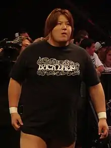 Morishima has also wrestled in the United States. He competed in Harley Race's World League Wrestling promotion in 2003, defending the WLW Heavyweight Championship, which he had won from Ron Harris while Harris toured Japan.[16] Morishima returned to the United States in February 2007, wrestling four matches with Ring of Honor. He lost to Samoa Joe on February 16, 2007 before defeating Homicide in a match for the ROH World Championship on the subsequent evening, thus becoming the first non-American to hold the title.[6][17] On February 23, 2007, Morishima defeated B.J. Whitmer in his first title defense, and on the next night he and Nigel McGuinness defeated Samoa Joe and Homicide.[6] On March 4, 2007, he successfully defended the ROH Championship in Japan, defeating Kenta in the Nippon Budokan in Tokyo.[6] Morishima could not return to the United States until almost a month and a half later when he and Chris Hero took on Nigel McGuinness and Doug Williams, and the next night when he successfully defended the belt against McGuinness for the first time.[6]