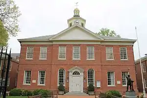 After the American Revolutionary War in 1786, Act to Assemble in Annapolis appointed John Needles to survey and "to erect a town in Talbot County to be called Talbottown"—laying out a town around then existing court house with 118 number parcels of land and designated streets, alleys and lanes. Talbottown was to be known as the county seat of Easton.[5] Another act was passed in 1789 to build a larger courthouse on the site of the old one. This court house was completed in 1794 and today parts of it still stand today inside of the present court house.[5]