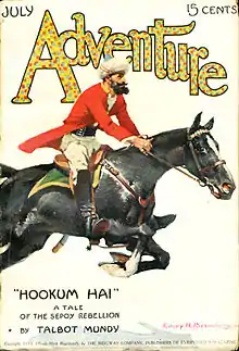 In Norway, Mundy authored his first novel, For the Peace of India, which was set during the Indian Rebellion of 1857. It was serialised in Adventure under the altered title of Rung Ho! before being published by Charles Scribner in the U.S., and Cassells in the U.K. Critically well received, the book sold well.[69] In August 1914, Adventure published "The Sword of Iskander", the first of Mundy's eight novelettes revolving around the character of Dick Anthony of Arran, a Scotsman battling the Russians in Iran, which ran until March 1915.[70] It was in his January 1914 short story "A Soldier and a Gentleman" that he introduced the character of Yasmini, a young Hindu woman who would reappear in many of his later stories.[71] He then began work on a second novel, The Winds of the World, which told the story of a Sikh officer, Risaldar-Major Ranjoor Singh, who sets out to expose a German spy who is attempting to foment an uprising in British India; during the course of the story he introduced Yasmini as a character. Serialised in Adventure from July to September 1915, it was then published in Britain by Cassell; when Scribner declined to publish it, Mundy acquired a literary agent, Paul Reynolds.[72] Upon publication, it received good reviews.[73]