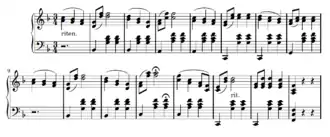 Waltz sections 2A and 2B are in B-flat major, whereas waltz 3A is in E-flat major with a quick section in B-flat in waltz 3B. The entire waltz section 4 is in B-flat as well, and waltz section 5 is wholly in E-flat. Waltz 5B contains the customary climax with cymbals and is loudly played. After a brief and tense coda, waltz 1A and 2B make a reappearance. As the waltz approaches its end, the zither solo makes another appearance, reprising its earlier melody in the introduction. A crescendo in the final bars concludes with a brass flourish and snare drumroll.