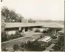 The Taliesin house had three sections: two broad portions on either end and a narrow connecting loggia.[24] Typical of a Prairie School design, the house was, as Wright described, "low, wide, and snug."[25] As with most of his houses, Wright designed the furniture.[25] One of these broad sections was used as Wright's studio and workroom. A small apartment wing juts out of this wing; the apartment may have originally been intended for Wright's mother, but was used by Wright's head draftsman.[26] Wright and Borthwick lived in the other broad portion. The one-story complex was accessed by a road leading up the hill to the rear of the building.[24] The estate gateway was on County Road C, just west of Wisconsin Road 23. Iron entry gates were flanked by limestone piers capped with planter urns.[27]