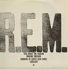 "Talk About the Passion" is a song by the American alternative rock band R.E.M., released as the second single released from its debut album Murmur in 1983. It was released in Europe only, on 12" vinyl. This song failed to follow up on the success of "Radio Free Europe" released earlier in the year, as it did not chart. A live performance at Larry's Hideaway, Toronto, Ontario, Canada, from July 9, 1983 was released on the 2008 Deluxe Edition reissue of Murmur.