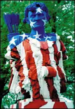 A portrait of Chief Tamanend wearing three feathers on top of his head and carrying a quiver filled with arrows on his back. The sculpture rests atop a tall square base. The sculpture is a bronze cast of the wooden ships figurehead carved by William Luke for the USS Delaware. This bronze replica was cast from the wooden original in 1930 at the U.S. Navy gun factory.[2]
