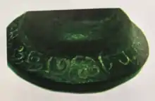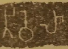 A steatite seal from a signet ring found in an early Iron Age burial in Anaikoddai, Jaffna. The seal contains both Brahmi and megalithic graffiti symbols arranged in a way that suggests that they may be a translation of each other.[5] |