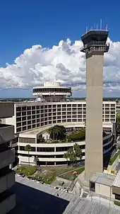 Tampa International Airport (IATA: TPA, ICAO: KTPA, FAA LID: TPA) is an international airport six miles (9.7 km) west of Downtown Tampa, in Hillsborough County, Florida, United States. The airport is publicly owned by Hillsborough County Aviation Authority (HCAA).[3] It has been praised for its architecture and Landside/Airside design of a central terminal (landside) connected by people movers to four satellite air terminals and gates (airsides), a pioneering concept when designed in the late 1960s. The airport was called Drew Field Municipal Airport until 1952.[4]
