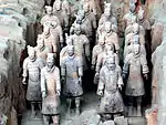 For instance, numerous tomb artefacts of soldiers (also known as a "terracotta army") have been found in the Mausoleum of the First Qin Emperor. The Qin dynasty was militaristic, heavy-handed and bureaucratic - it was a time of intense and constant warfare with its neighbours and its military was the most powerful and technologically advanced in the world.[16] Therefore, it is unsurprising to find an overwhelming quantity of tomb figurines cast in the image of soldiers in the tomb of Qin Shi Huang, the first emperor of China.