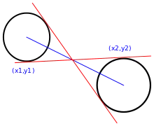 In general the points of tangency t1 and t2 for the four lines tangent to two circles with centers v1 and v2 and radii r1 and r2 are given by solving the simultaneous equations: