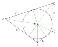 In Euclidean geometry, a tangential quadrilateral (sometimes just tangent quadrilateral) or circumscribed quadrilateral is a convex quadrilateral whose sides all can be tangent to a single circle within the quadrilateral. This circle is called the incircle of the quadrilateral or its inscribed circle, its center is the incenter and its radius is called the inradius. Since these quadrilaterals can be drawn surrounding or circumscribing their incircles, they have also been called circumscribable quadrilaterals, circumscribing quadrilaterals, and circumscriptible quadrilaterals.[1] Tangential quadrilaterals are a special case of tangential polygons.