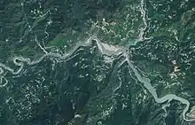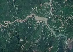 Tangjiashan Lake (Chinese: 唐家山堰塞湖, literally "Tang's Mountain landslide dam-created lake") is a landslide dam-created lake on the Jian River, which was formed by the 2008 Sichuan earthquake.[1] Its name comes from the nearby mountain Tangjiashan. On May 24, 2008 the water level rose by 2 metres (6 ft 7 in) in a single day, reaching a depth of 23 metres (75 ft), just 29 metres (95 ft) below the barrier level.[1][2] On June 9 2008, more than 250,000 people have been evacuated from Mianyang in anticipation of the Tangjiashan Lake dam bursting.[3][4]