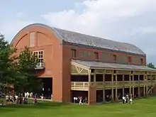 The following year, the Eliel Saarinen-designed, fan-shaped Shed (now known as the Koussevitzky Music Shed, or simply "the Shed") was constructed, with some 5,100 seats, giving the BSO a permanent open-air structure in which to perform.[7] Broad lawns extend beyond the Shed, providing outdoor space for concert goers and sweeping views of Stockbridge Bowl and Monument Mountain in the distance. At the opening ceremony for the Shed on August 4, 1938, Gertrude Robinson Smith's dedication comments were recorded and can be heard today.[8] The Boston Symphony Orchestra has performed in the Koussevitzky Music Shed every summer since, except for the interval 1942–45 when the Trustees canceled the concerts and summer school due to World War II. The Shed was renovated in 1959 with acoustic designs by BBN Technologies. In 1986 the BSO acquired the adjacent Highwood estate, increasing the property area by about 40%. Seiji Ozawa Hall (1994) was built on this newly expanded property.[9] Leonard Bernstein conducted the Boston Symphony at Tanglewood in August 1990 in what proved to be his final concert. Deutsche Grammophon released a live recording of the concert on CD.