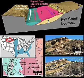 Tanis is the name given to a site of paleontological interest in southwestern North Dakota, United States.[1] Tanis is part of the heavily studied Hell Creek Formation, a group of rocks spanning four states in North America renowned for many significant fossil discoveries from the Upper Cretaceous and lower Paleocene. Tanis is an extraordinary and unique site because it appears to record the events from the first minutes until a few hours after the impact of the giant Chicxulub asteroid in extreme detail. This impact, which struck the Gulf of Mexico about 66 million years ago, wiped out all non-avian dinosaurs and many other species (the so-called "K-Pg" or "K-T" extinction). The extinction event caused by this impact paved the way for the domination of the Earth by mammals, including human beings.